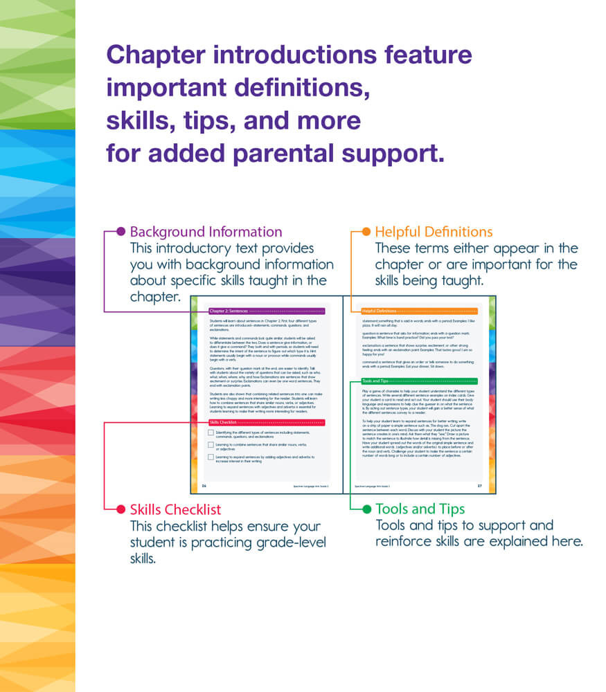 Aligned to current state standards, this 2nd grade English Language Arts (ELA) workbook includes an answer key and a supplemental Writer’s Guide to reinforce grammar and language arts concepts.