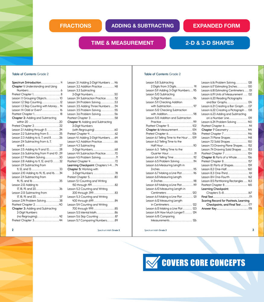 Provide a spectrum of math support for your second grader with the Spectrum® 2nd grade math workbook. This standards-aligned math workbook helps kids stay at the top of their math game with engaging time telling practice, writing numbers expanded form, fractions, and more. Parent support pages are included at the beginning of each chapter with helpful definitions, tools and tips, and a skills list to support your child along the way.