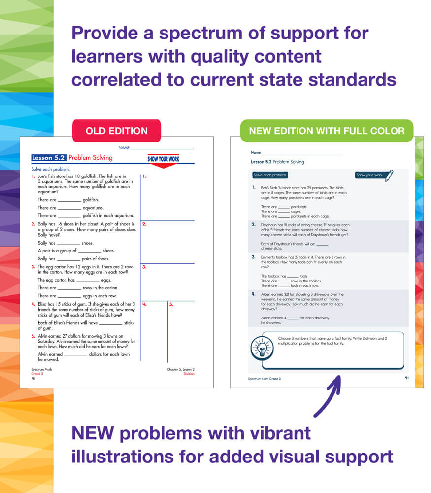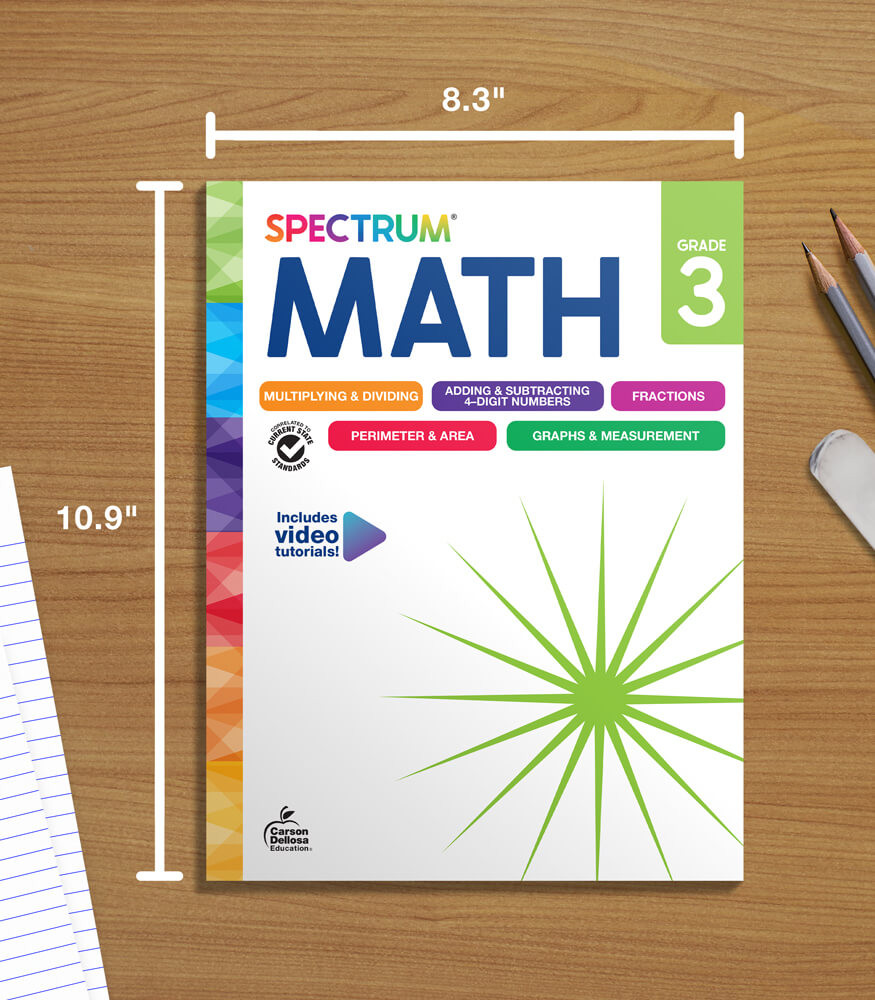 Provide a spectrum of math support for your third grader with the Spectrum® 3rd grade math workbook. This standards-aligned math workbook helps kids stay at the top of their math game with engaging multiplication and division practice, working with fractions, and more. Parent support pages are included at the beginning of each chapter with helpful definitions, tools and tips, and a skills list to support your child throughout their learning journey. QR codes are also included throughout the math workbook that take you to free video tutorials to help explain and break down certain concepts. Tests are also included in every chapter to test student progress along the way.