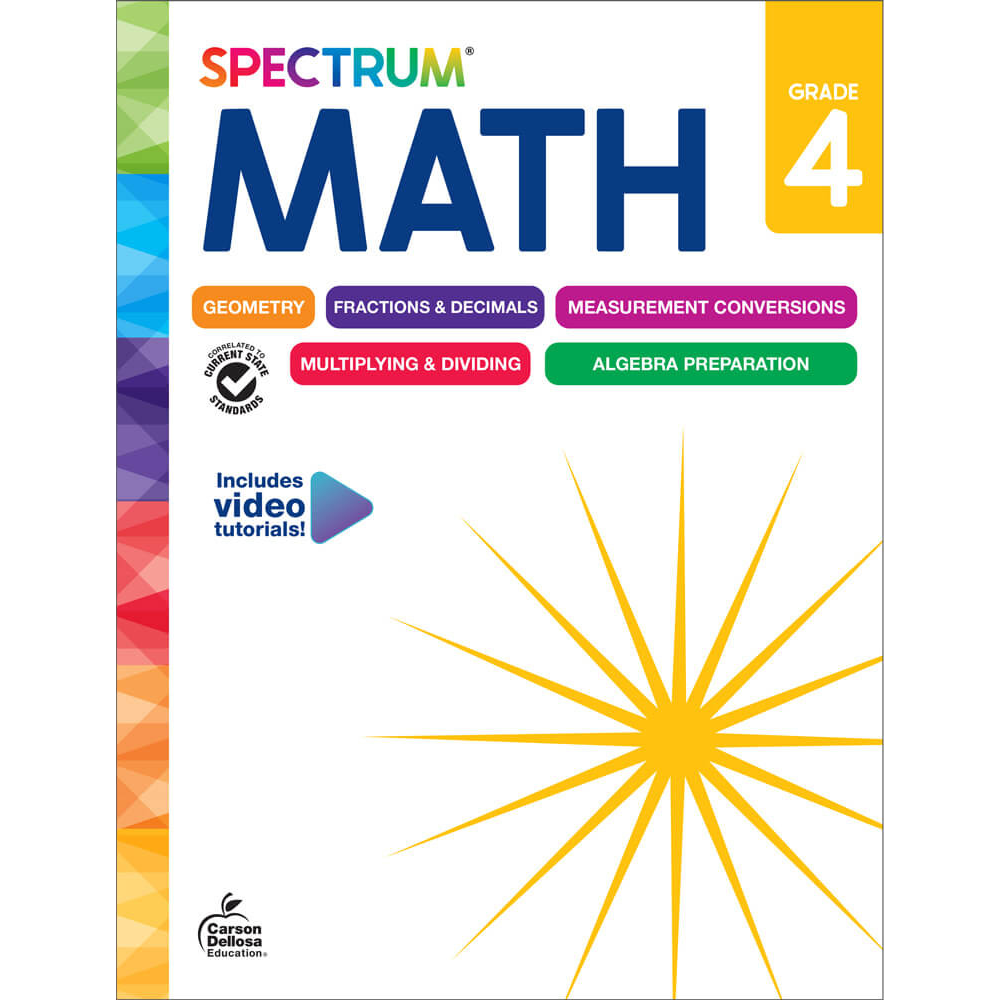 Provide a spectrum of math support for your fourth grader with the Spectrum® 4th grade math workbook. This standards-aligned math workbook helps kids stay at the top of their math game with engaging geometry and algebra prep practice, decimals and fractions, and more. Parent support pages are included at the beginning of each chapter with helpful definitions, tools and tips, and a skills list to support your child throughout their learning journey. QR codes are also included throughout the math workbook that take you to free video tutorials to help explain and break down certain concepts. Tests are also included in every chapter to test student progress along the way.