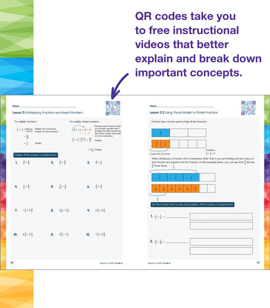 Provide a spectrum of math support for your sixth grader with the Spectrum® 6th grade math workbook. This standards-aligned math workbook helps kids stay at the top of their math game with engaging geometry practice, multiplying and dividing fractions, and more. Parent support pages are included at the beginning of each chapter with helpful definitions, tools and tips, and a skills list to support your child throughout their learning journey. QR codes are also included throughout the math workbook that take you to free video tutorials to help explain and break down certain concepts. Tests are also included in every chapter to test student progress along the way.
