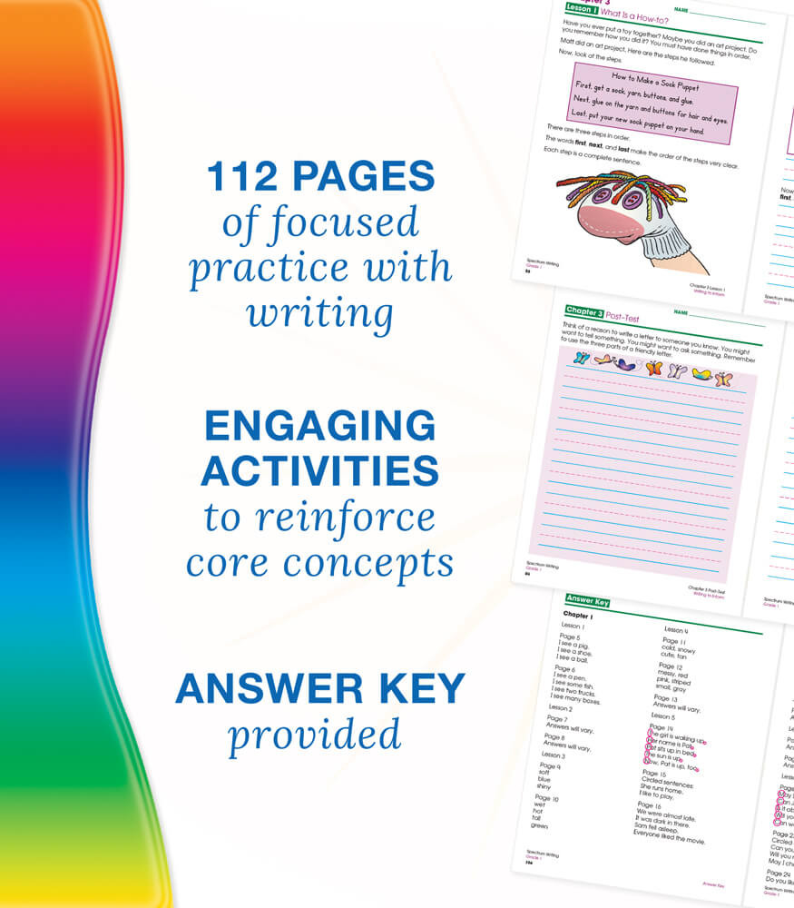 Strong writing skills help children soar! Clear, concise communication benefits kids throughout school and into adulthood. Spectrum® Writing for grade 1 guides blossoming writers through the writing, proofreading, and editing process to create a strong foundation essential for school success.