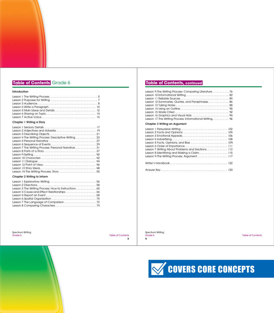 Strong writing skills help children soar! Clear, concise communication benefits kids throughout school and into adulthood. Spectrum® Writing for grade 6 guides blossoming writers through the writing, proofreading, and editing process to create a strong foundation essential for school success.